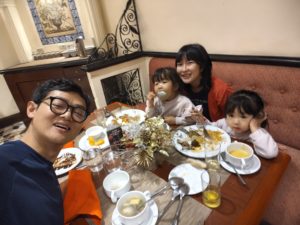 High Streetの広い公園で突然現れた同年代の女の子と仲良くなり20分くらいひたすら鬼ごっこ。皆疲れたところでバイバイして夕食へ。